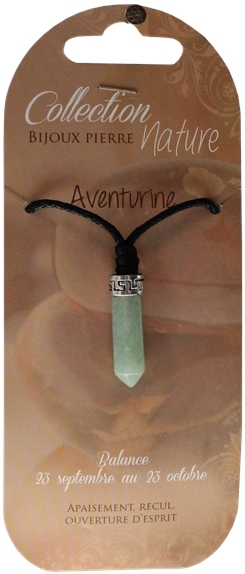 Pendentif pointe polie d'aventurine monté sur cordon noir. Hauteur de la pointe : 3 cm. Vendus par lot de 6 ex.