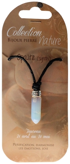 Pendentif pointe polie d'opalite monté sur cordon noir. Hauteur de la pointe : 3 cm. Vendus par lot de 6 ex.