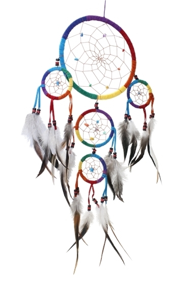 D'après la mythologie Indienne, l'attrapeur de rêve ne laisse passer que les rêves heureux tandis qu'il attrape tous les mauvais rêves dans le filet. Fabriqué à la main et orné de pierres, de perles et de plumes, l'attrapeur de rêve est une parure décorative exceptionnelle. Dreamcatcher en tissus. Hauteur : 70 cm - Largeur : 23 cm - Diamètres 16,5 cm - 8 cm - 6 cm.
