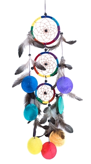 D'après la mythologie Indienne, l'attrapeur de rêve ne laisse passer que les rêves heureux tandis qu'il attrape tous les mauvais rêves dans le filet. Fabriqué à la main et orné de perles et de plumes, l'attrapeur de rêve est une parure décorative exceptionnelle. Dreamcatcher en tissus, plumes et perles. Hauteur : 51 cm - Largeur : 16 cm - Diamètres 9 cm - 8 cm - 6,5 cm.