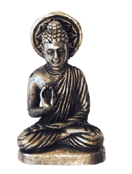 Statue de Bouddha en position assise, le bras droit levé, la main à demi-ouverte pour que le pouce et l’index se joignent et forment un cercle, une roue. Il symbolise ainsi l’enseignement. Lot de 3.