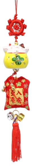 Porte-bonheur chat jaune Maneki Neko en céramique avec petite bourse et clochettes. Porte-bonheur chinois, apporte chance et richesse. Idéalement se tient en main ou peut aussi s'accrocher sur un objet ou dans un lieu où l'on souhaite obtenir les vertus prétendues. Hauteur du pendentif : environ 30 cm.