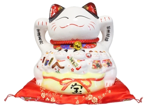 Magnifique tirelire Chat Maneki Neko en céramique, hauteur 22cm. Ce chat Maneki Neko porte-bonheur vous apportera réussite au travail. Le Maneki Neko, appelé aussi couramment chat japonais porte-bonheur est une statuette traditionnelle de la culture Japonaise.