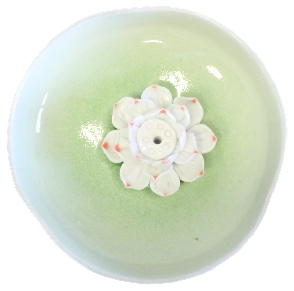Porte-encens anis avec fleur de Lotus, diamètre environ 12 cm. Le Lotus représente la possibilité pour tout être humain de parvenir à l'état de Bouddha quelles que soient ses conditions de vie. Il incarne l'élévation de l'âme, d'abord purement matérialiste au travers de ses racines, puis goutant l'expérience de l'eau au travers de sa tige, pour enfin parvenir à l'illumination et l'éveil au travers de sa fleur. Les bouddhistes tibétains voient dans la fleur de Lotus la véritable nature des Etres, la tige étant le samsara (cycles des vies et morts), la fleur symbolisant la paix et la sérénité.