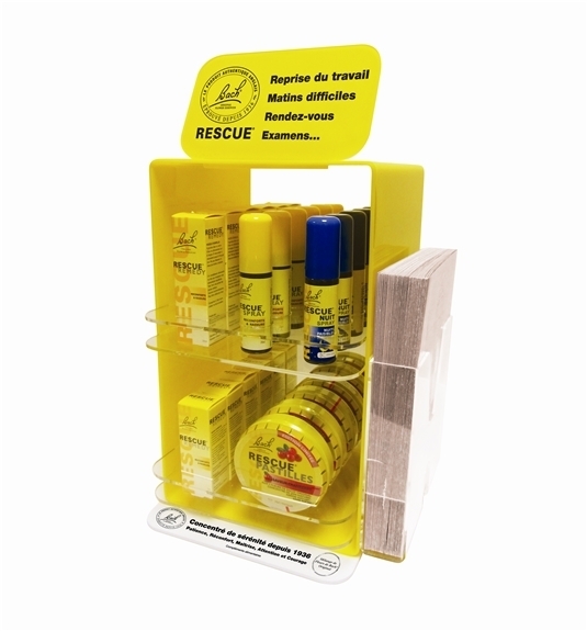 Rescue®, le célèbre flacon jaune, est un mélange de 5 Fleurs de Bach® Original qui participe à l'équilibre des émotions en toute circonstance. Le présentoir plein se compose de : - 6 Rescue® Goutte 20 ml - 6 Rescue® Sray 20 ml - 6 Rescue® Spray nuit 20 ml - 6 Rescue® Kids 10 ml ou 6 Rescue® Pets 10 ml - 6 Rescue® Pastilles Cranberry - 25 Brochures Rescue®