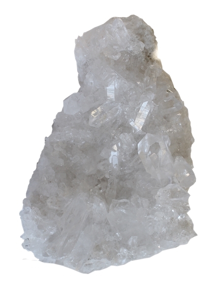 Le Cristal de Roche clarifie nos idées et nos émotions, chassant le superflu et renforçant nos convictions, nos idéaux. Il accentue les propriétés des pierres qui l'accompagnent et leur confère plus de puissance lorsque les leurs effets sont trop discrets. Toutes les programmations sont possibles sur le Cristal de Roche, ce qui en fait la pierre universelle en lithothérapie. Les amas de cristaux de roche amplifient les effets du cristal de roche et les diffusent dans toutes les directions. Ce sont d'excellentes pierres pour élever le taux vibratoire dans un lieu de vie et diffuser des énergies lumineuses. Un amas purifié et chargé transmet son énergie aux pierres placées en son centre. On peut l'utiliser en intérieur, ou placé au soleil ou à la lune pour accélérer et amplifier le rechargement des autres pierres.