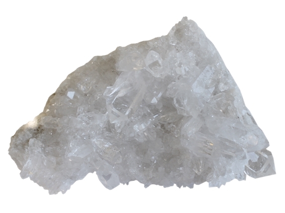 Le Cristal de Roche clarifie nos idées et nos émotions, chassant le superflu et renforçant nos convictions, nos idéaux. Il accentue les propriétés des pierres qui l'accompagnent et leur confère plus de puissance lorsque les leurs effets sont trop discrets. Toutes les programmations sont possibles sur le Cristal de Roche, ce qui en fait la pierre universelle en lithothérapie. Les amas de cristaux de roche amplifient les effets du cristal de roche et les diffusent dans toutes les directions. Ce sont d'excellentes pierres pour élever le taux vibratoire dans un lieu de vie et diffuser des énergies lumineuses. Un amas purifié et chargé transmet son énergie aux pierres placées en son centre. On peut l'utiliser en intérieur, ou placé au soleil ou à la lune pour accélérer et amplifier le rechargement des autres pierres.