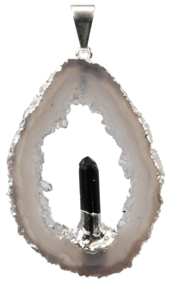 Pendentif argenté - Géode d' Agate avec pointe Tourmaline Noire