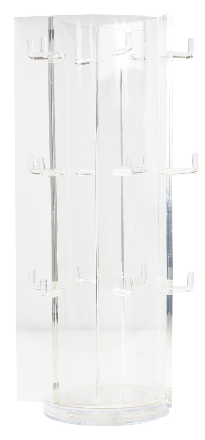 Présentoir comptoir rotatif en plexi de 3 faces. Chaque côté contient 6 crochets pour y suspendre vos bracelets. Hauteur : 33 cm Largeur : 11 cm.