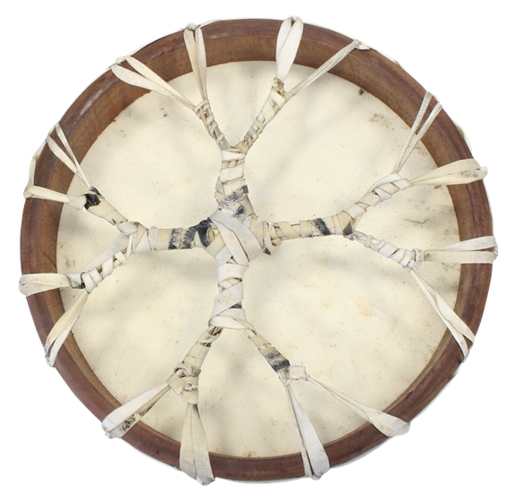 Superbe tam-tam entièrement fabriqué suivant les méthodes traditionnelles. Le son du tambourin change suivant le degré d'humidité de la peau. Plus le tambour est sec, plus son timbre sera élevé. La peau du tam-tam (cerf) est tendue de façon à s'accommoder de presque tous les environnements. Le laçage du tambour est en lanières de peau brute. Les lanières sont rassemblées au centre du tambour et rejointes en forme de croix, laquelle est entourée dans du cuir pour un confort optimal. Le cadre est un cerceau en bois courbé d'érable. Diamètre : 30 cm.
