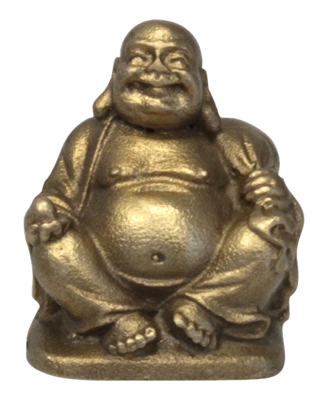 Hauteur : 4 cm. Le bouddha rieur est traditionnellement dépeint comme un homme gras, chauve et portant une robe. Il peut parfois porter un chapelet. Dans sa main, il portera souvent des lingots d'or, ou une gourde chinoise Wu Lou, ou un lingot, un sac de trésors, ou des balles de jade ou bien encore de grandes perles. Il est toujours souriant ou riant. Il est accueilli par tous les gens partout où il va. Son visage apparaît partout dans la culture chinoise : suivant sa position, il sera synonyme de chance, santé, fortune, sagesse, réussite ou amour. Bouddha assis avec une pêche dans sa main droite, à placer dans le coin Est de la maison. Il apporte la SANTE.