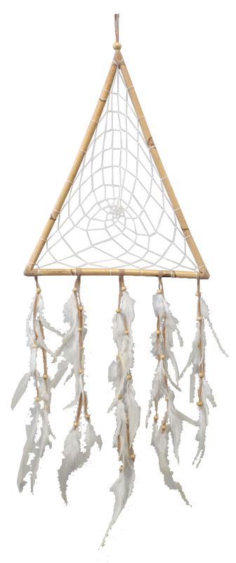 D'après la mythologie Indienne, l'attrapeur de rêve ne laisse passer que les rêves heureux tandis qu'il attrape tous les mauvais rêves dans le filet. Fabriqué à la main et orné de perles et de plumes, l'attrapeur de rêve est une parure décorative exceptionnelle. Dreamcatcher triangulaire en bois de saule, fait de plumes et de perles. Hauteur totale : 88,5 cm - Largeur : 31 cm - Hauteur du triangle : 38 cm.