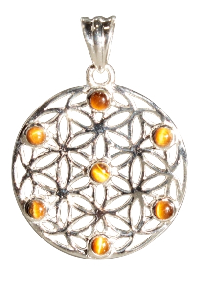 Pendentif en Argent 925/1000 en forme de Fleur de Vie avec 7 pierres naturelles Oeil de Tigre. Taille des pierres : 3mm - Diamètre du pendentif : 2,9 cm.