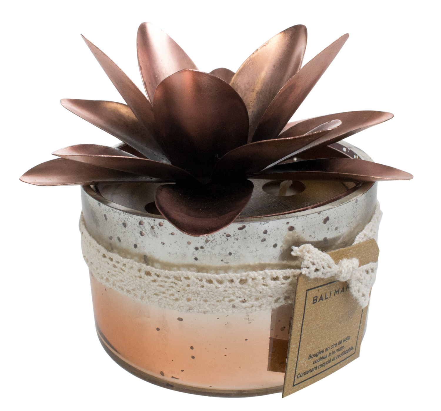 Bougie dans pot en verre, contenance 236 ml. Senteur Nag Champa. Dimensions de la bougie : diam. 9,7 cm x H 6 cm. Composition : Huile de Soja partiellement hydrogénée et paraffine. Composée de 9% de parfum. Méche écologique. Le pot est fabriqué et peint à la main et avec de la peinture métal recyclée.