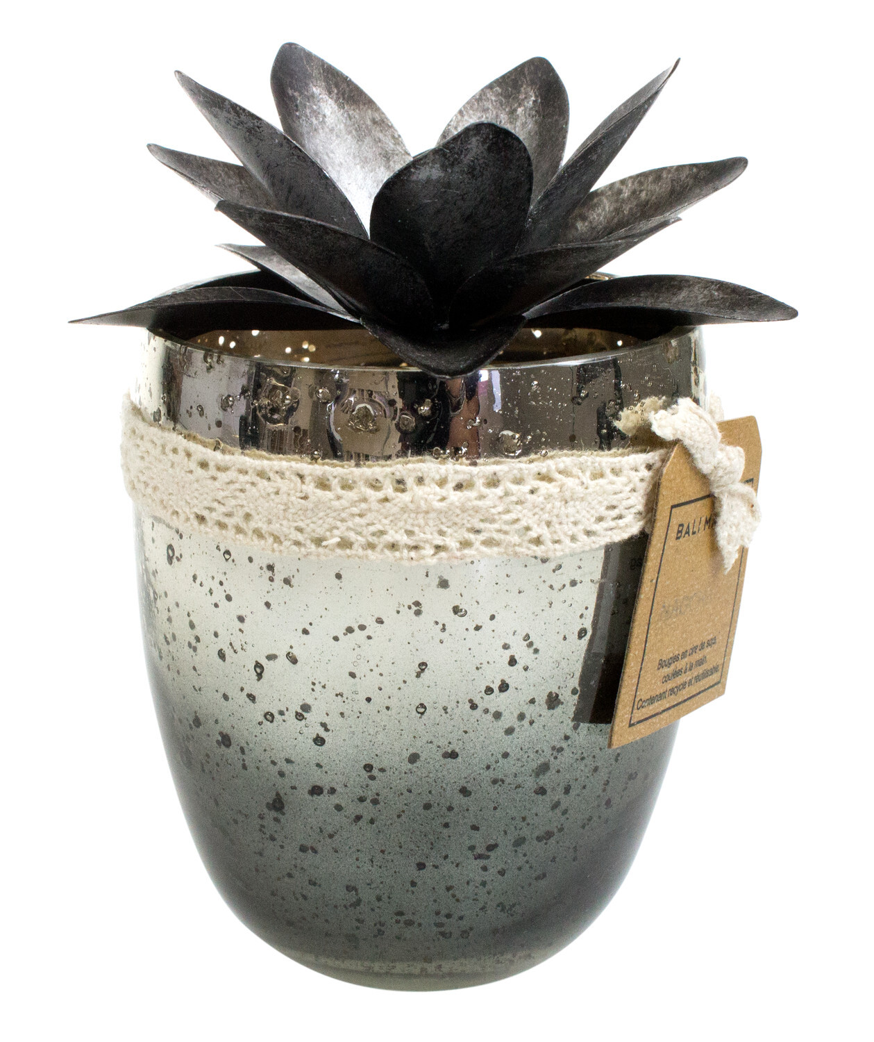 Bougie dans pot en verre, contenance 266 ml. Senteur Nag Champa. Dimensions de la bougie : diam. 8,2 cm x H 10 cm. Composition : Huile de Soja partiellement hydrogénée et paraffine. Composée de 9% de parfum. Méche écologique. Le pot est fabriqué et peint à la main et avec de la peinture métal recyclée.