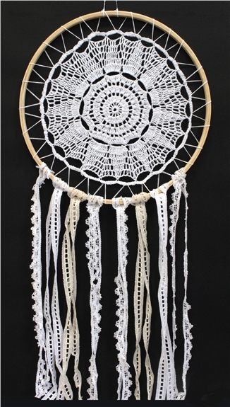 D'après la mythologie Indienne, l'attrapeur de rêve ne laisse passer que les rêves heureux tandis qu'il attrape tous les mauvais rêves dans le filet. Fabriqué à la main et orné de perles et de plumes, l'attrapeur de rêve est une parure décorative exceptionnelle. Dreamcatcher fait au crochet, plumes, perles et dentelle. Hauteur : 76 cm - Largeur : 31 cm - Diamètre : 30 cm.