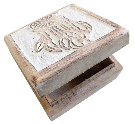 Boîte en bois de manguier patinée blanche, intérieur en bois brut .Cette boîte est idéale pour ranger vos effets personnels (bijoux, encens, pierres…). Sculptée à la main. Dimensions de la boîte : 13,7 x 13,7 cm.