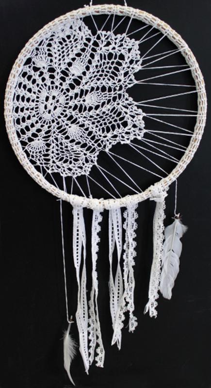 D'après la mythologie Indienne, l'attrapeur de rêve ne laisse passer que les rêves heureux tandis qu'il attrape tous les mauvais rêves dans le filet. Fabriqué à la main et orné de crochets et de dentelle, l'attrapeur de rêve est une parure décorative exceptionnelle. Hauteur : 71,5 cm - Largeur : 25,5 cm.