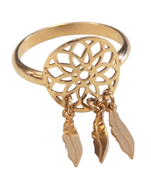 Bague dreamcatcher en argent plaqué or rose avec plumes. Taille 52. Diamètre du cercle 1,3 cm.