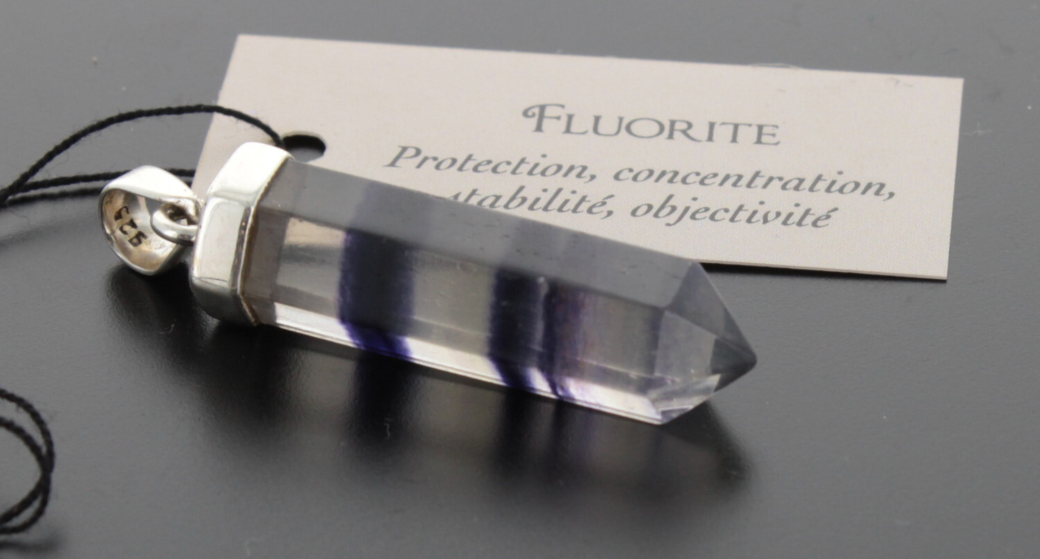 Pendentif en argent, pierre naturelle Fluorite d'excellente qualité. Hauteur du pendentif entre 3 et 4 cm. Spécifiquement tournée vers la sphère de l’esprit, la Fluorite apporte une grande clarté mentale et développe nos facultés de mémorisation. Elle aide à structurer la pensée tout en apportant beaucoup de joie et d’esprit positif. Elle sera ainsi parfaite pour soutenir les étudiants de tout âge dans leur apprentissage.