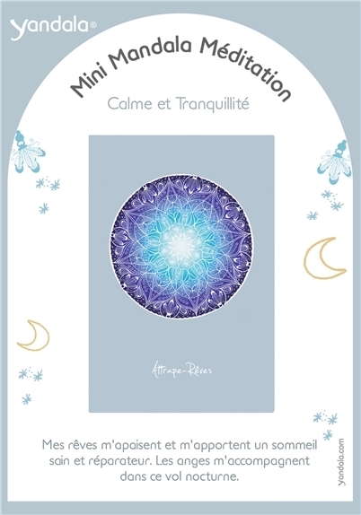Dimensions : 15 x 10,5 cm. La visualisation des mandalas permet d'amorcer un magnifique voyage intérieur et d'atteindre un niveau de conscience profond. Observez la carte en vous imprégnant des formes et des mouvements. Concentrez-vous et laissez vous aller à la relaxation. Mémorisez et ressentez au plus profond de vous même le texte écrit au dos de la carte. Grâce aux mini mandalas de méditation, vous activez positivement vos forces intérieures et votre mental. Vous pourrez ainsi créer une harmonie entre le corps et l'esprit qui vous accompagnera au quotidien et vous apportera force, courage, espoir et joie. Pour choisir votre mini yandala laissez-vous porter par votre intuition. Ce travail vous permettra de réfléchir sur vos besoins actuels et de les cibler avec clarté. Cette collection de 12 Yandala est réalisée et peinte à la main par l'artiste allemande Yvonne Lamberty. Calme et Tranquillité - Attrape-Rêves : Mes rêves m'apaisent et m'apportent un sommeil sain et réparateur. Les anges m'accompagenent dans ce vol nocturne. Copyright By Yvonne Lamberty.