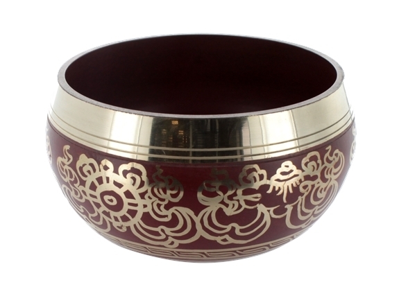 Bol chantant de couleur bordeaux fabriqué à la main au Népal, gravé avec le symbole double dorje à l'intérieur et symboles Tibétains à l'extérieur comme par exemple le nœud de l'éternité. Diamètre : 12 cm. Bol de qualité supérieure. Fourni sans bâton.