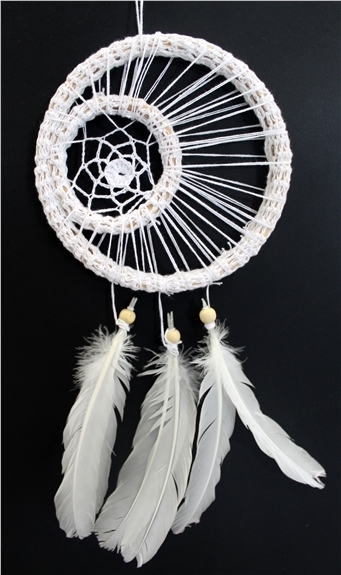 D'après la mythologie Indienne, l'attrapeur de rêve ne laisse passer que les rêves heureux tandis qu'il attrape tous les mauvais rêves dans le filet. Fabriqué à la main et orné de perles et de plumes, l'attrapeur de rêve est une parure décorative exceptionnelle. Dreamcatcher fait au crochet, plumes, perles et dentelle. Hauteur : 34 cm - Diamètre : 15 cm.
