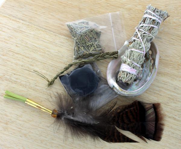 La fumigation était utilisée traditionnellement par les autochtones d'Amérique du Nord pour purifier les lieux, les gens et lors des cérémonies. Mini kit de fumigation comprenant : un Abalone (coquille d'ormeau), de la sauge, cèdre et foin d'odeur en sachets, une pastille de charbon de bois et une plume pour la fumigation.