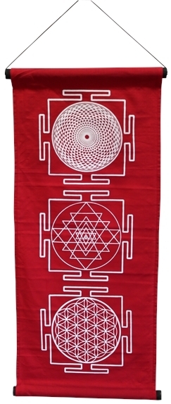 Jolie tenture en coton imprimé Géométrie Sacrée de couleur framboise avec écriture en blanc. La géométrie Sacrée est la science descriptive qui met en lumière l'harmonie de notre monde. Elle est le reflet de notre conscience d'être. Tenture que vous pourrez utiliser en décoration murale. Dimensions : 38 x 95 cm. Livrée avec un petit sac de transport.
