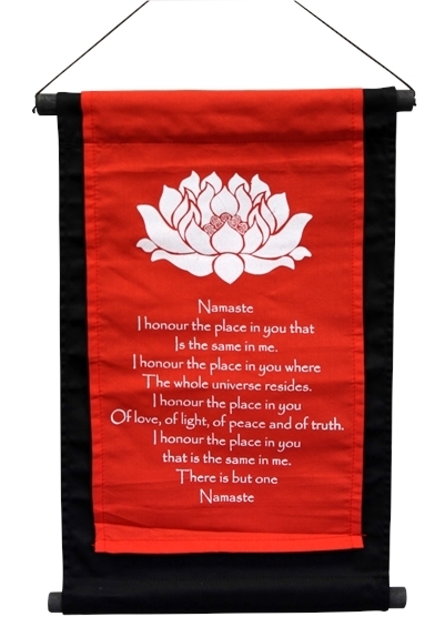 Jolie tenture en coton imprimé Lotus Namaste de couleur rouge avec écriture en blanc. Namasté symbolise la croyance qu'il existe une lumière divine en chacun de nous, située dans le chakra du cœur. Tenture que vous pourrez utiliser en décoration murale. Dimensions : 28 x 40 cm. Livrée avec un petit sac de transport.
