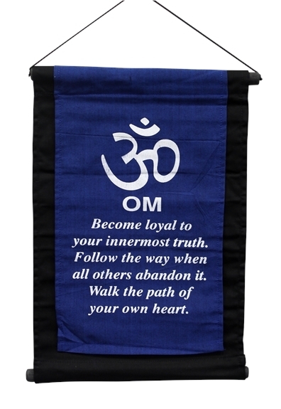 Jolie tenture en coton imprimé Om de couleur bleue avec écriture en blanc. Tenture que vous pourrez utiliser en décoration murale. Dimensions : 28 x 40 cm. Livrée avec un petit sac de transport.