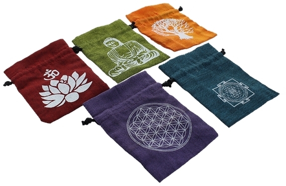 Lot de 5 pochettes Théme Méditation en coton : Violette symbole Fleur de vie, Orange symbole Arbre de Vie, Bordeaux symbole Lotus, Turquoise symbole Shri Yantra, Verte symbole Buddha. Dimensions : 8 x 11 cm.