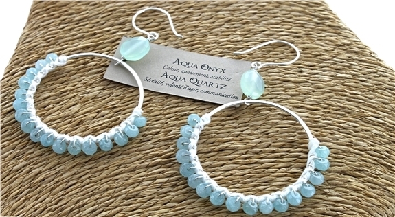 Boucles d'oreilles en Argent ornées de Aqua Onyx et Aqua Quartz.L'Aqua Onyx symbolise le calme, l'apaisement, la stabilité et la sagesse. L'Aqua Quartz possède les propriétés de sérénité, volonté d'agir et communication.