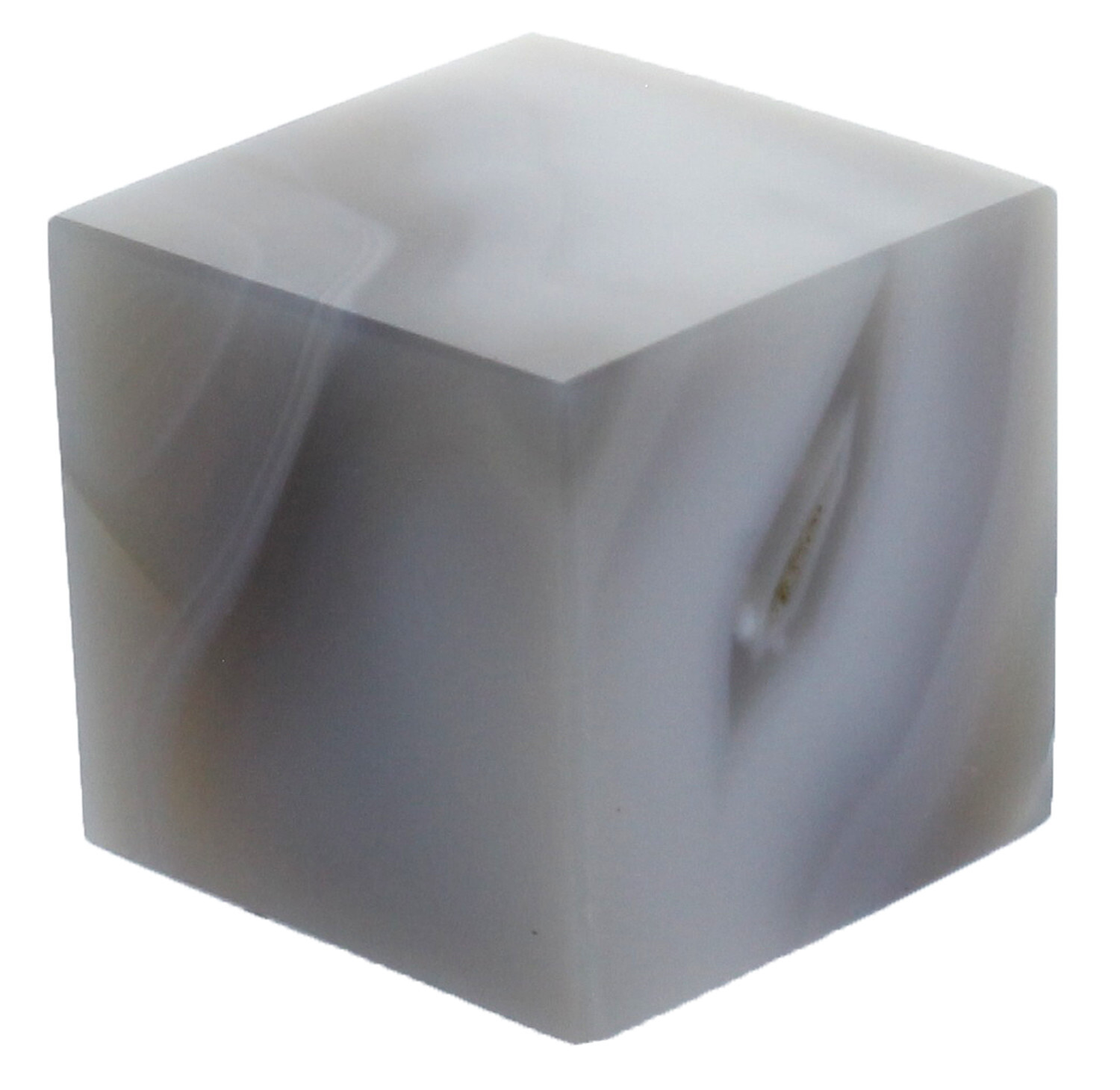 Cube en Agate de 3,5 cm. Au Moyen Age, on nouait des agates aux cornes des bœufs pour obtenir une bonne récolte. Cette roche a souvent été liée au fil des siècles aux rapports de l’homme avec la nature, favorisant la pousse généreuse des végétaux du jardin, protégeant contre les morsures des serpents, les piqûres d’insectes ou de scorpions. C’était également une pierre protectrice contre les petits maux et ennuis quotidiens. Elle a en effet la réputation de favoriser l’équilibre du corps et de l’esprit, évitant les chutes aussi bien que les blocages énergétiques. Cette pierre est associée au deuxième chakra, lié à l’énergie sexuelle, aux relations humaines et à la créativité.