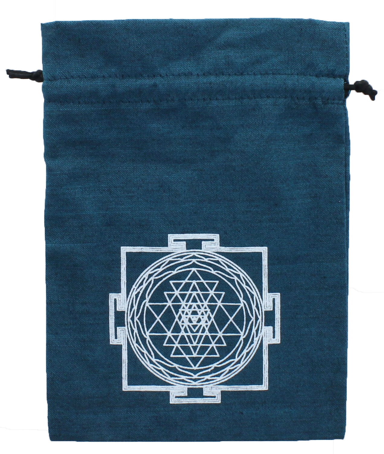 Bourse pour tarots et oracles Shri Yantra de couleur turquoise. En coton et polyester. Dimensions : 15 x 20 cm.