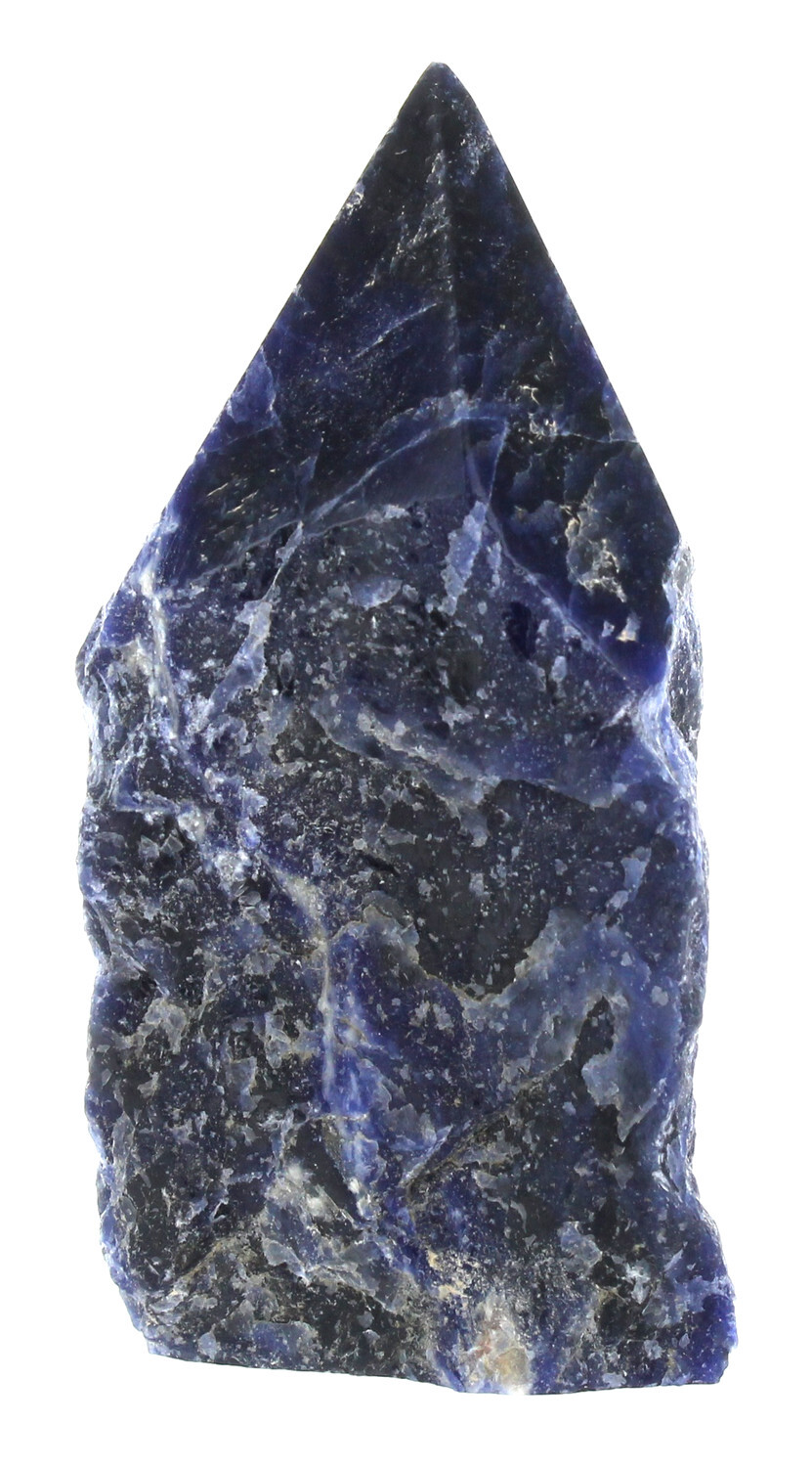 Pointe brute en Sodalite environ 350 gr. Développe la conscience de nos actes et de leurs conséquences, l'élévation de l'esprit ainsi que la réflexion structurée. La sodalite inspire ainsi la soif de connaissance afin de comprendre le monde qui nous entoure. Enfin, elle facilite la détente, la réflexion et la méditation.