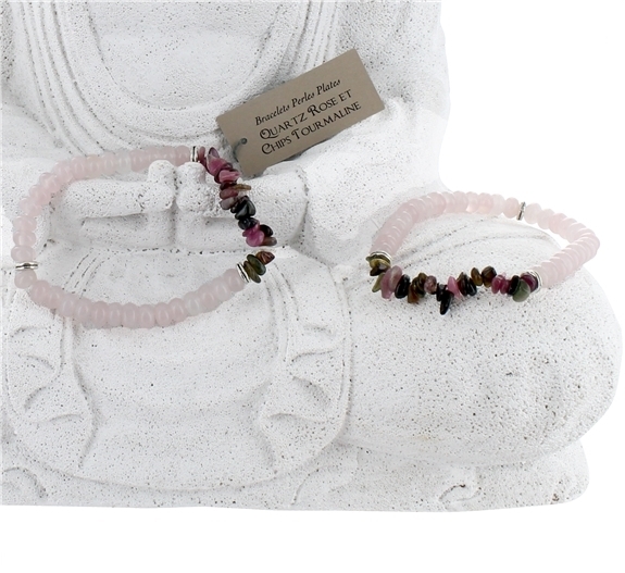 Bracelet Quartz Rose Perles plates et Tourmaline Chips