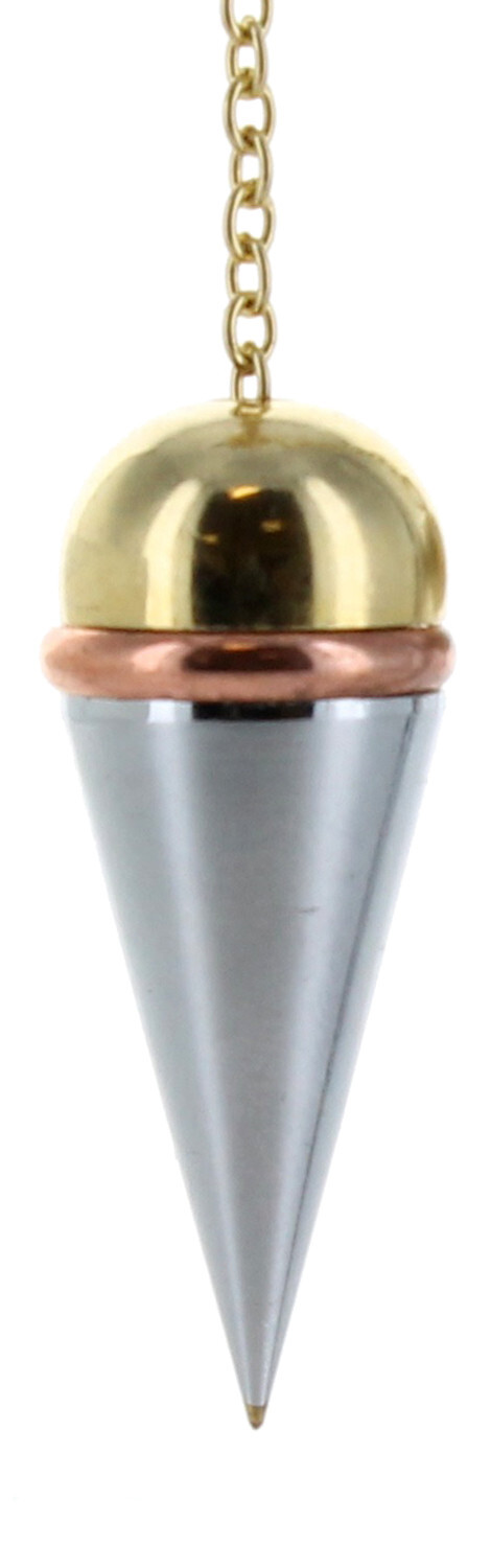 Pendule pointe témoin, doré et argenté avec anneau en cuivre. L'anneau permet une meilleure circulation de l'énergie. Très bonne sensibilité réceptrice. Monté avec une chaîne dorée. Diamètre : 1,3 cm. Hauteur : 3,5 cm.