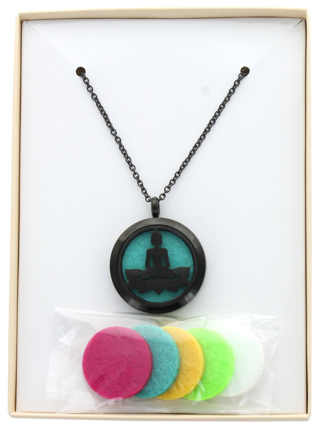 Bijou Diffuseur de Parfum ou d'Huile Essentielle Méditation. Diamètre du pendentif : 30mm - Pendentif en acier inoxydable - chaîne de 82 cm - 5 disques de tissus absorbants en suédine. Ce collier vous permet de profiter des bienfaits de l'aromathérapie toute la journée ! Signification du pendentif : Ce pendentif sur le thème de la Méditation évoque la bienveillance, l'attention et la recherche spirituelle..Comment utiliser le pendentif diffuseur d'Huiles Essentielles : Le médaillon de votre pendentif s'ouvre facilement. Vous pouvez y glisser la feutrine, enduite de quelques gouttes de l'huile essentielle choisie. Vous pourrez changer de couleur au gré de vos envies : 5 tissus absorbants de couleurs différentes sont fournis avec le collier. Les différentes couleurs de feutrine peuvent vous permettre de changer la couleur de votre bijou ou dédier une feutrine à une huile spécifique. La diffusion se fait ensuite par simple évaporation. Les huiles n'étant pas chauffées, elles conservent toutes leurs propriétés. Ce collier vous permet de diffuser votre parfum, tout au long de la journée, sans qu'il soit directement en contact avec votre peau. Recharge de 5 Buvards disponible : référence 68210
