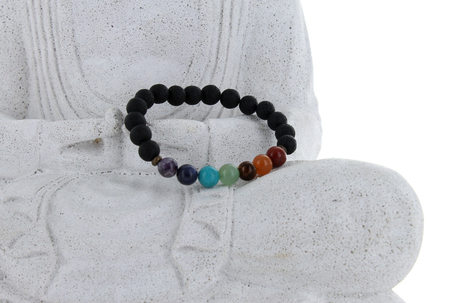 Bracelet en Pierre de Lave naturelle et 7 perles aux couleurs des 7 chakras : Améthyste, Sodalite, Howlite teintée, Aventurine verte, Oeil de tigre, Calcite orange et Jaspe Rouge. Idéal pour les amateurs de Yoga et de méditation. Diamètre des perles : 8 mm.
