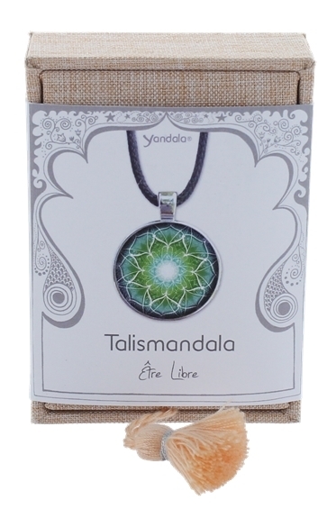 Pendentif Yandala Etre Libre. Cette collection de Yandala est réalisée et peinte à la main par l’artiste allemande Yvonne Lamberty. Liberté - Être Libre : La paix m’envahit et remplit mon cœur de légèreté. Je me sens totalement libre et sans barrière. Copyright By Yvonne Lamberty. Pendentif en métal + plaquage rhodium - Diamètre 3 cm - Pendentif livré dans une boîte en tissu de couleur vieux rose munie d'un fourreau imprimé en quadrichromie reprenant toutes les propriétés du Yandala. Cordon noir inclus.
