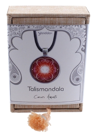 Pendentif Yandala Cœurs Aimants. Cette collection de Yandala est réalisée et peinte à la main par l’artiste allemande Yvonne Lamberty. La Conscience du Cœur - Cœurs Aimants : Lorsque deux cœurs se rencontrent et s’unissent dans le véritable amour vous découvrirez la félicité, la chance, la gaieté et le paradis sur Terre. Copyright By Yvonne Lamberty. Pendentif en métal + plaquage rhodium - Diamètre 3 cm - Pendentif livré dans une boîte en tissu de couleur vieux rose munie d'un fourreau imprimé en quadrichromie reprenant toutes les propriétés du Yandala. Cordon noir inclus.