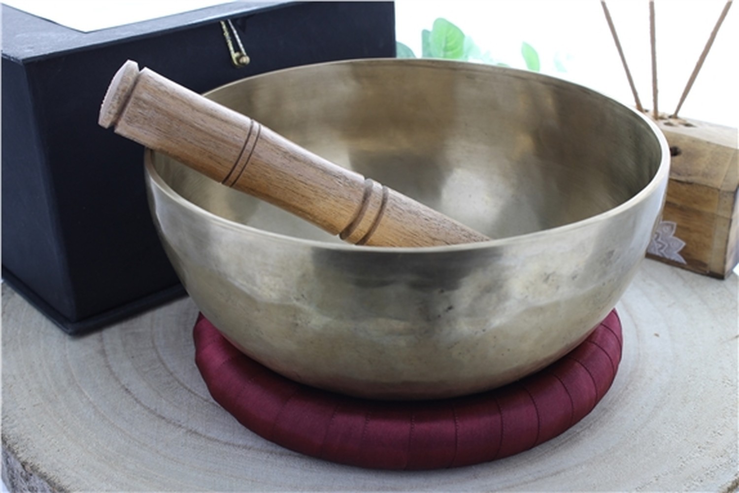 Bol chantant fabriqué en Inde, fabrication artisanale. Diamètre : 18 cm. Bol de qualité supérieure. Coffret complet, le bol est conditionné dans une boîte noire en carton qui comprend également un bâton en bois naturel de manguier et un anneau pour bol chantant bordeaux. Composition : Fabrication avec un mélange de 5 métaux : Cuivre, Laiton et Zinc, Etain et une petite quantité de Fer afin d'obtenir la meilleure sonorité possible. Les bols chantants sont idéaux pour la détente du corps et de l'esprit. Idéaux pour le yoga et la méditation.