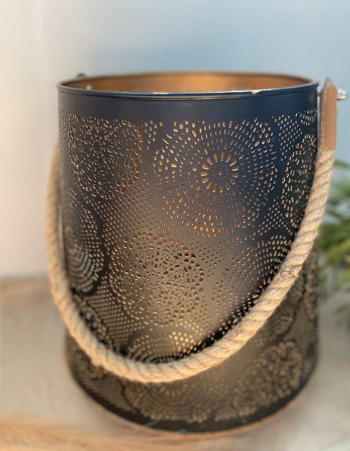 Photophore Rond Base Bois Sangle Jute [DESCRIPTION] Design Mix Mandala. Associé à votre pratique de la méditation, ce photophore vous aidera à trouver un sentiment de plénitude, de bonheur, de chance, de prospérité et d'amour. [CARACTÉRISTIQUES] Photophore rond en métal (40% fer, 40% bois, 10% jute), base bois, sangle en jute, de couleur noire à l'extérieur et noir et cuivré à l'intérieur. Dimensions : 28 x 30 cm. Bougie non fournie. [CONSEILS D'UTILISATION] À utiliser avec une bougie ronde ou cylindrique au diamètre inférieur à celui du photophore.