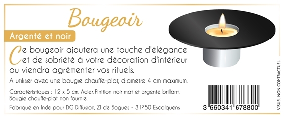 Bougeoir en acier, finition argenté brillant et noir mat. S'utilise avec des bougies chauffe-plat d'un diamètre maximum de 4 cm. Ce bougeoir ajoutera une touche d'élégance et de sobriété à votre décoration d'intérieur ou viendra agrémenter vos rituels. Dimensions : H 5 cm, Ø 12 cm. Bougies non fournies.