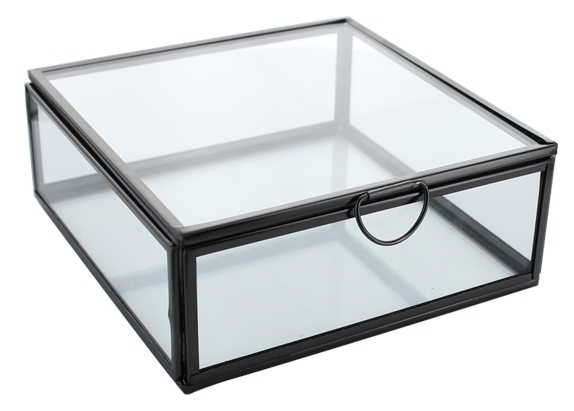 Boîte de forme carrée composée de verre et d'une structure en métal finition noire. A la fois pratique et élégante, cette boîte vous permettra de ranger vos bijoux et/ou vos pierres roulées. Dimensions : 15 x 15 x 6 cm