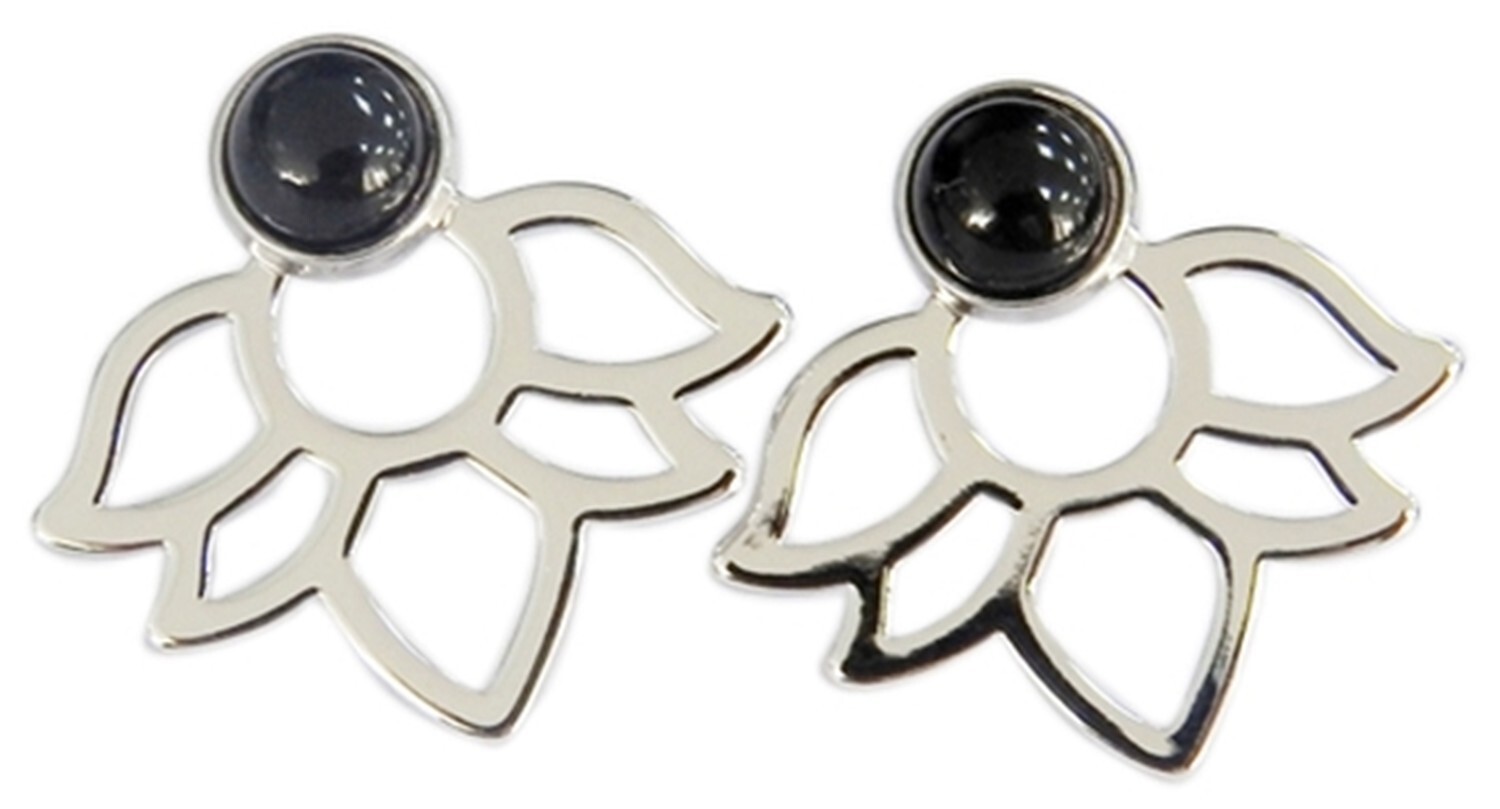 Boucles d'oreilles Onyx Noir Perle et Lotus Métal argenté