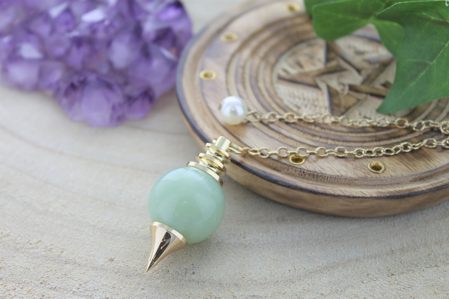 Pendule Séphoroton en pierre de Calcédoine Verte et métal à la finition dorée [DESCRIPTION] Pendule composé d'une boule en pierre naturelle et d'une pointe en métal. Ce pendule Séphoroton est reconnu pour la qualité de ses résultats. Sa forme symétrique et son ergonomie en font un outil très précis et fiable. La calcédoine verte apporte calme et bienveillance et favorise l'acceptation des changements. [PACKAGING] Boîte coffret en carton noire avec fenêtre et étiquette adhésive imprimée.