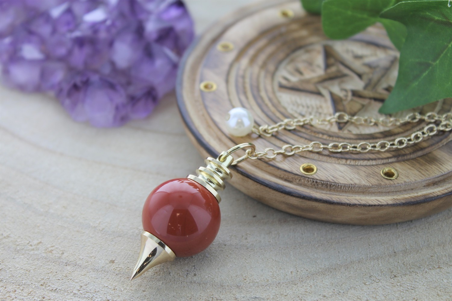 Pendule Séphoroton en pierre de Jaspe Rouge et métal à la finition dorée [DESCRIPTION] Pendule composé d'une boule en pierre naturelle et d'une pointe en métal. Ce pendule Sephoroton est reconnu pour la qualité de ses résultats. Sa forme symétrique et son ergonomie en font un outil très précis et fiable. Le Jaspe Rouge permet de mettre en évidence les problèmes et offre des aperçus sur les solutions. [PACKAGING] Boîte coffret en carton noire avec fenêtre et étiquette adhésive imprimée.