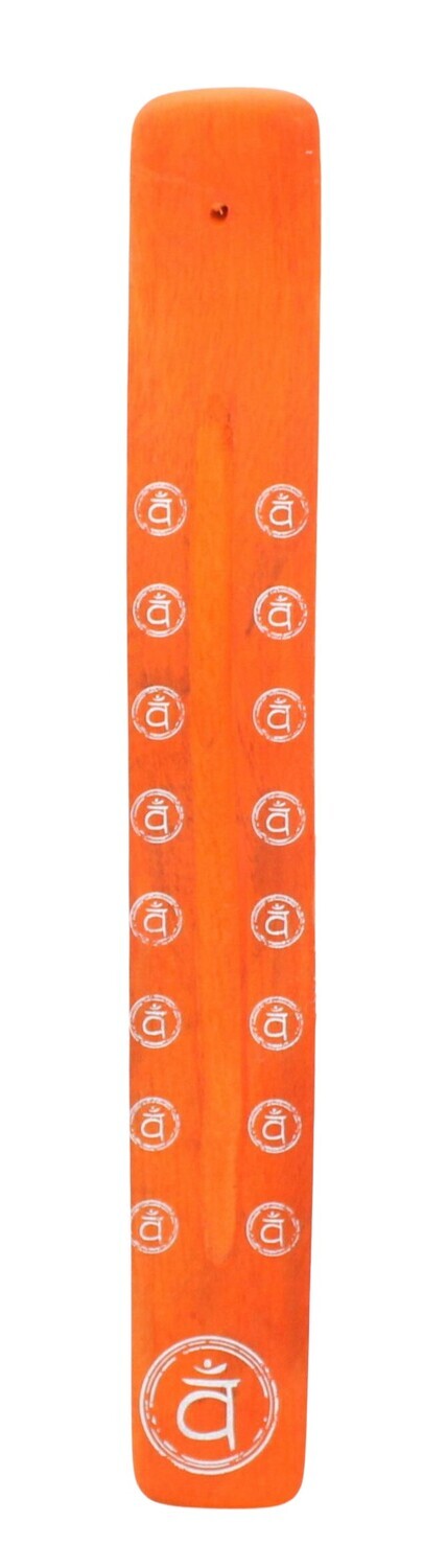Porte-encens pour bâton en bois de manguier chakra sacré CHAKRA & LUCK [DESCRIPTION] Porte-encens en bois de couleur orange adapté aux bâtons d'encens. Ce porte-encens représente le chakra sacré (Svadhishthana) qui correspond à l'apaisement, la sensualité et l'introspection. [CARACTÉRISTIQUES] Porte-encens en bois de manguier orange. Dimensions : 26 x 3,5 cm. Fabriqué en Inde. [CONSEILS D'UTILISATION] Allumer l'extrémité de l'encens jusqu'à ce qu'elle s'enflamme. Lorsqu'elle est incandescente, souffler dessus délicatement pour éteindre la flamme. Placer le bâton d'encens sur son porte-encens. [PACKAGING] Fourreau carton imprimé brochable